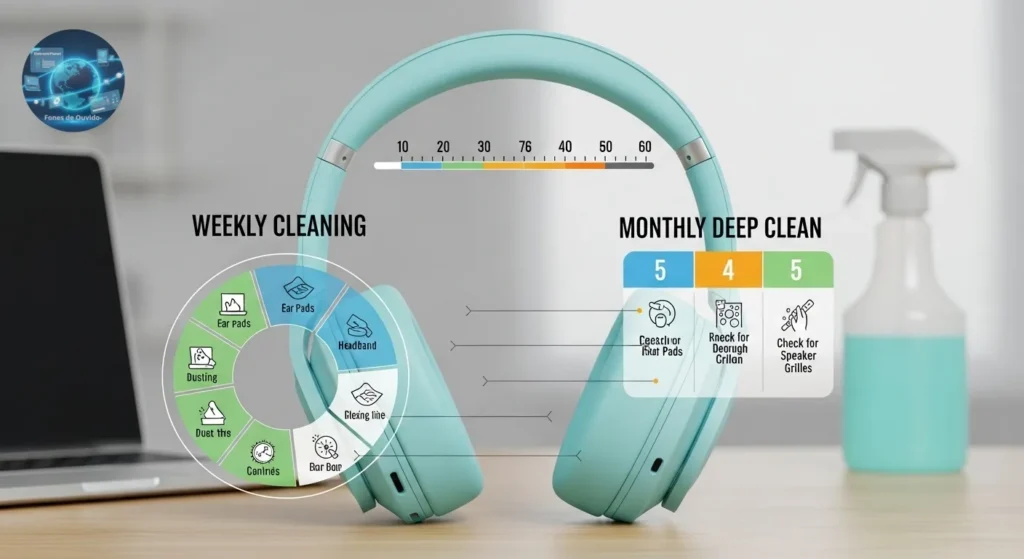 A frequência de limpeza pode variar conforme o uso e o tipo de fone, mas, de forma geral, recomenda-se: